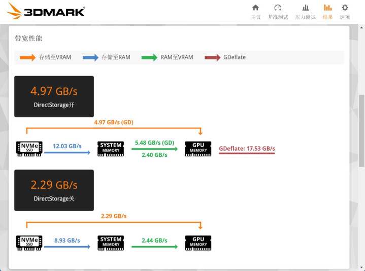 3DMARK DirectStorage功能测试是DirectX12 Ultimate的重要特性,它可以帮助PC更快的加载游戏,充分释放NVMe固态硬盘的潜力。实测启用DirectStorage之后,使用掠夺者GM9000HS神舆8TB速度是未开启之前的117%,进一步提升游戏的加载速度。