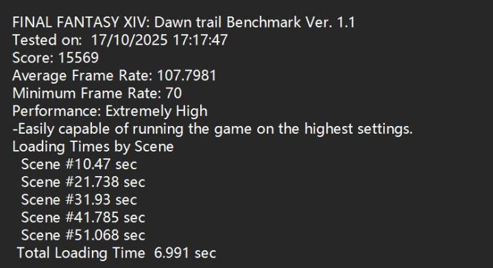 最后是《最终幻想14:曦光旅路》游戏加载模拟测试,这款DEMO能记录所有测试场景的载入时间。我们设置分辨率为3840x2160分辨率和最高画质,掠夺者GM9000HS神舆8TB加载所有场景时间仅为6.99秒,可大幅缩短游戏的加载时间,降低实时加载模型、贴图等素材的延迟。