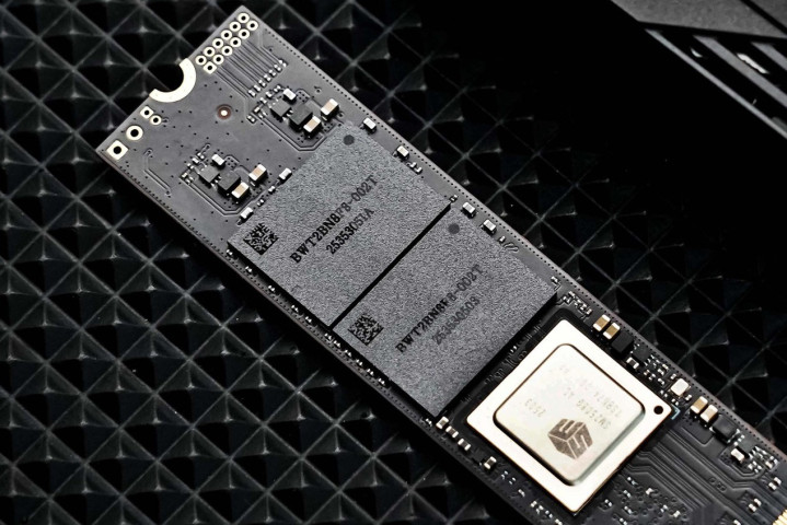 主控芯片为6nm工艺制程的SMI慧荣SM2508,支持PCIe5.0x4和NVMe2.0,拥有8闪存通道,顺序读写速度14.5GB/s和14GB/s,功耗转化效率提升70%,低功耗耗能降低40倍。核心元件NAND芯片为佰维封装的3D TLC,编号为BWT2BN8FF-002T,单颗容量2TB。