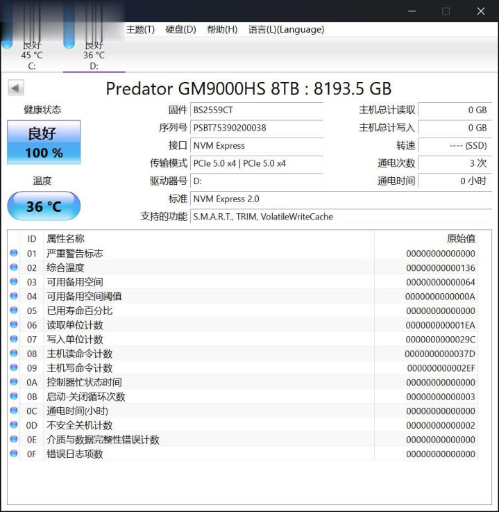 Crystal Disk Info的信息显示,掠夺者GM9000HS神舆8TB的实际容量为8139.5GB,即我们所说的足容量设计,采用PCIe5.0x4传输模式并支持NVMe2.0标准。温度方面,由于主动式散热片非常高效,在26℃室温下闲时仅为36℃。