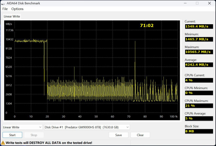 接下来是AIDA64全盘写入测试,从写入的曲线看,掠夺者GM9000HS神舆8TB在19%左右SLC缓存用尽,估算空盘SLC缓存容量达到惊人的1.5TB,最大限度提升大量数据的写入效能。