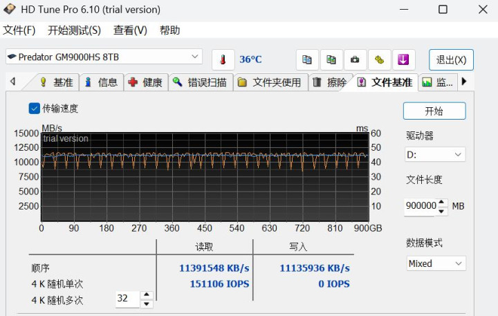 为了提升消费级固态硬盘的性能,行业普遍采用SLC缓存来提高TLC/QLC颗粒性能。为了避免软件报错,我们在HD Tune Pro中向掠夺者GM9000HS神舆8TB写入900GB的保守数据,通过图形可以看到写入曲线在8100MB/s和12000MB/s之间平稳波动,这是主控芯片的算法在调整。测试期间没有发生掉速现象,可知SLC缓存容量远超900GB。