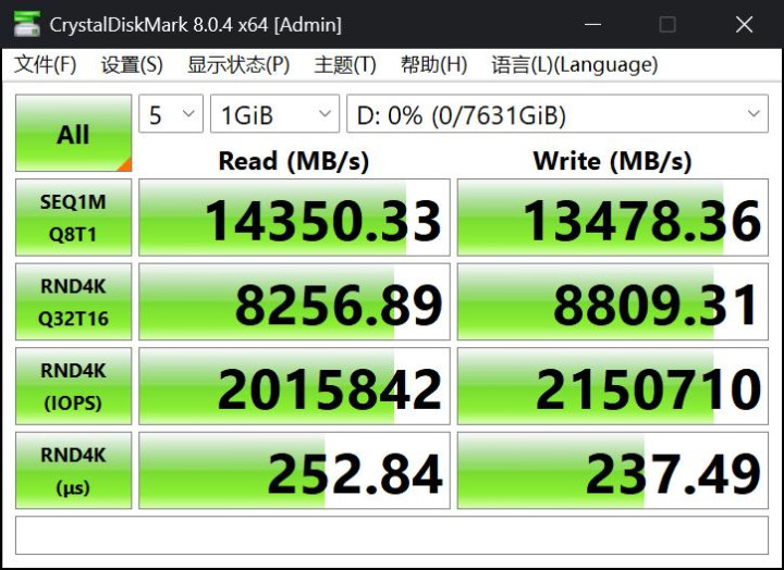 Crystal Disk Mark实测,掠夺者GM9000HS神舆8TB最高连续读写速度达到14350.33MB/s和13478.36MB/s,超过14000MB/s和13000MB/s的标称值,相对于PCIe4.0产品真正实现了翻倍超越。随机读取性能为2016K IOPS,与2000K IOPS标称值吻合,而随机写入性能达到了2151K IOPS,远超1600K IOPS标称值,实力非常优秀。